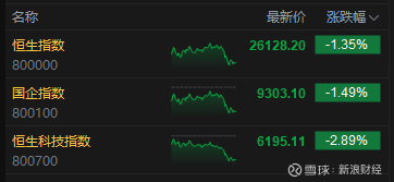 9月26日消息,港股三大指数低开低走。截至收盘,恒生指数跌1.35%,报26128.20点,恒生科技指数跌2.89%,国企指数跌1.49%。盘面上,科网股全线下跌,小米跌超8%,哔哩哔哩、阿里巴巴、京东、快手跌超3%,百度、美团、网易跌超1%;风电股走强,瑞风新能源涨超6%;保险股午后拉升,中国太平涨超2%;内银股活跃,中信银行涨超1%;生物医药股普跌,荣昌生物跌超4%。