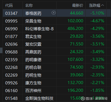 生物医药股普跌,荣昌生物跌超4%。美国总统特朗普宣布,从2025年10月1日起,将对任何品牌或专利的医药产品征收100%的关税,除非公司正在美国建立他们的制药工厂;如果药企工厂建设已经开始,将不会对这些药品征收关税。