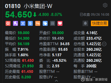 小米跌超8%。9月25日,小米举行新品发布会,发布小米17系列及众多科技家电新品。小米全系列价格方面,小米17价格4499元起,17Pro起售价4999元,小米17Pro Max起售价5999元(12GB+512GB)。雷军谈iPhone17与小米17,表示iPhone17也做得非常好,这次更新被称为牙膏挤爆了,但是iPhone17在硬件配置上与小米17比还是有差距。同时,小米推出汽车推出定制服务,计划三年设计100款车漆。