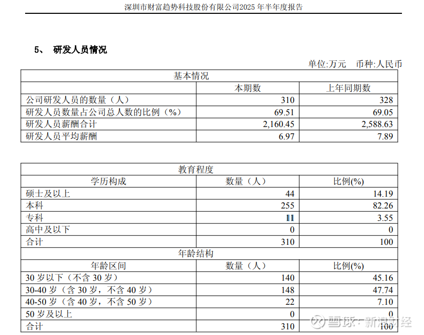 截至2025年上半年末,财富趋势研发人员数量为310人,上年同期数328人。2025H1研发人员平均薪酬为 6.97万元,较上年同期的7.89万元同比减少11.66%。