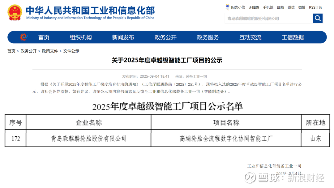 近日,国家工业和信息化部发布《关于2025年度卓越级智能工厂项目的公示》。在这份代表中国智能制造最高水平的名单中,青岛森麒麟轮胎股份有限公司(以下简称“森麒麟”)凭借 “高端轮胎全流程数字化协同智能工厂” 项目成功入选。
