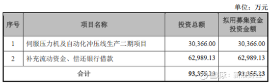 最后,此次定增计划募资9.34亿,6.3亿用于补充流动资金、偿还银行借款,3.04亿用于“伺服压力机及自动化冲压线生产二期项目”。