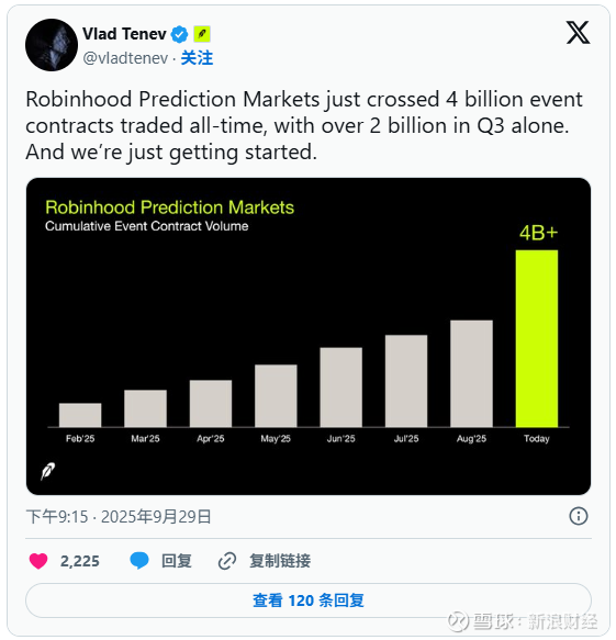在线股票经纪公司Robinhood(HOOD.US)首席执行官Vladimir Tenev在X平台发布消息称,Robinhood已强势切入预测市场领域,用户可在此类市场中对选举、体育赛事等高关注度事件进行投注,此举推动该公司周一股价单日涨超12%。据Tenev透露,Robinhood客户已累计交易超40亿份预测市场合约,仅第三季度就达成20亿份交易量,占累计量的一半。
