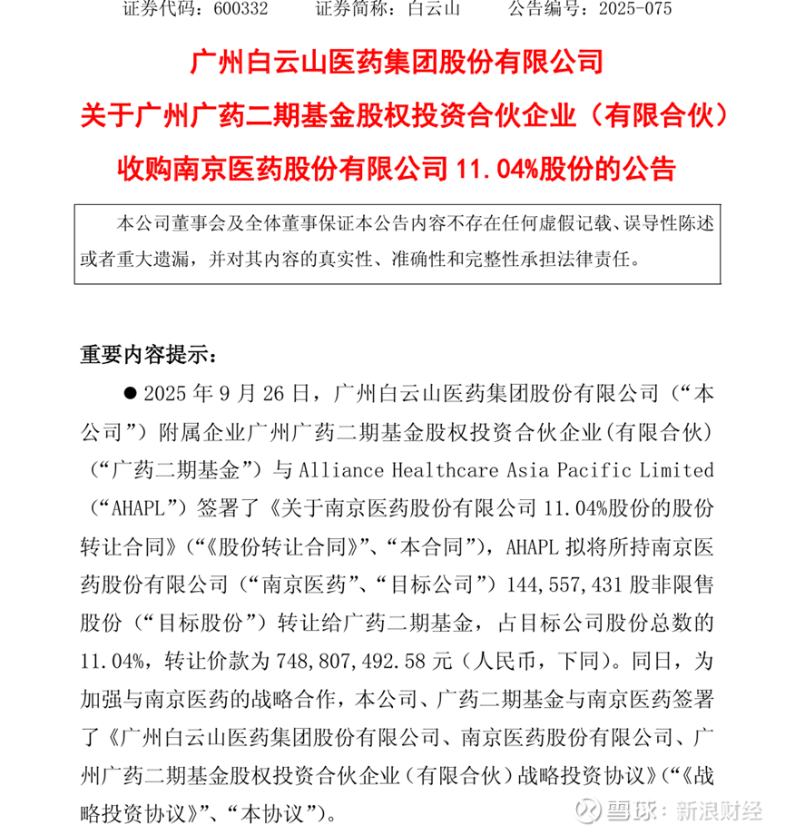 9月28日,广药集团旗下上市公司广州白云山医药集团股份有限公司(以下简称“白云山”)与南京医药股份有限公司(以下简称“南京医药”)同时发布公告,白云山旗下广州广药二期基金股权投资合伙企业(有限合伙)(以下简称“广药二期基金”)拟出资748,807,492.58元人民币收购Alliance Healthcare Asia Pacific Limited(“AHAPL”)持有的南京医药股份144,557,431股非限售股份,占南京医药总股份数的11.04%。收购完成后,广药二期基金拟将成为南京医药第二大股东。