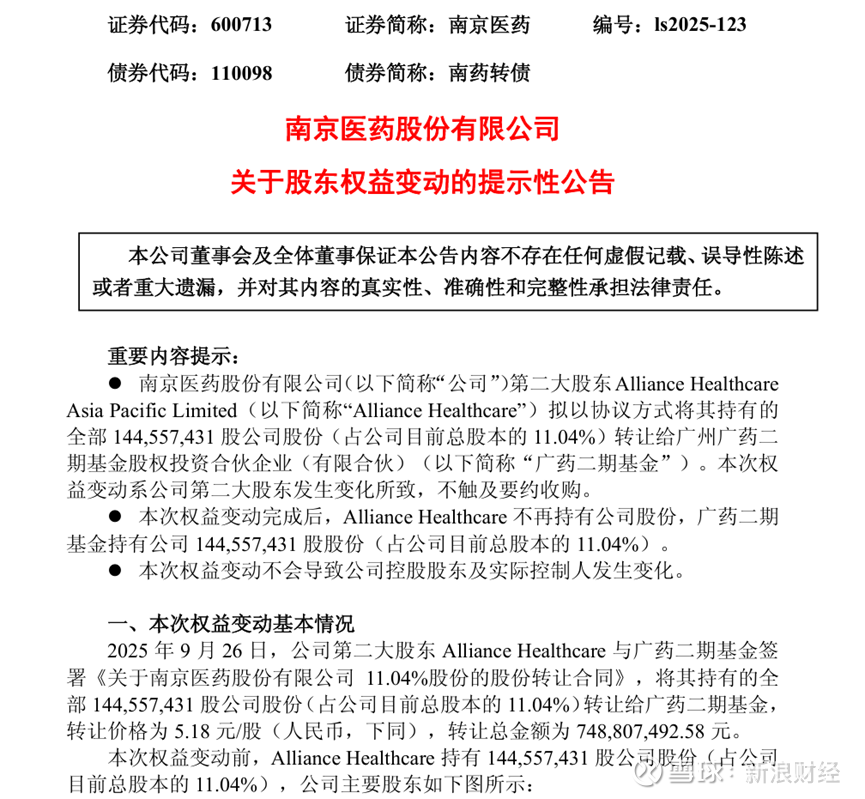 根据公告,9月26日,广药二期基金与AHAPL签署了《关于南京医药股份有限公司11.04%股份的股份转让合同》(“《股份转让合同》”),AHAPL拟将所持南京医药144,557,431股非限售股份转让给广药二期基金。买卖双方同意,以该合同签署日前60个交易日目标公司的每日收盘价的算术平均值为基础,目标股份的价格为5.18元/股,目标股份转让价款总计为748,807,492.58元。