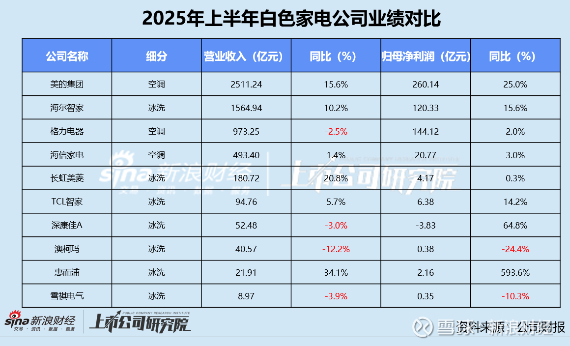 更进一步来看,3家空调企业总营收为3977.89亿元,归母净利润合计425.03亿元,约占比66.9%、76.6%,与2024年上半年相比分别提高8.8%、15.0%;其余7家水洗企业总营收为1964.34亿元,归母净利润(含亏损)合计129.94亿元,约占比33.1%、23.4%,与2024年上半年相比分别提高14.1%、24.6%。报告期内,澳柯玛、雪祺电气营收、净利双降,均为水洗公司。