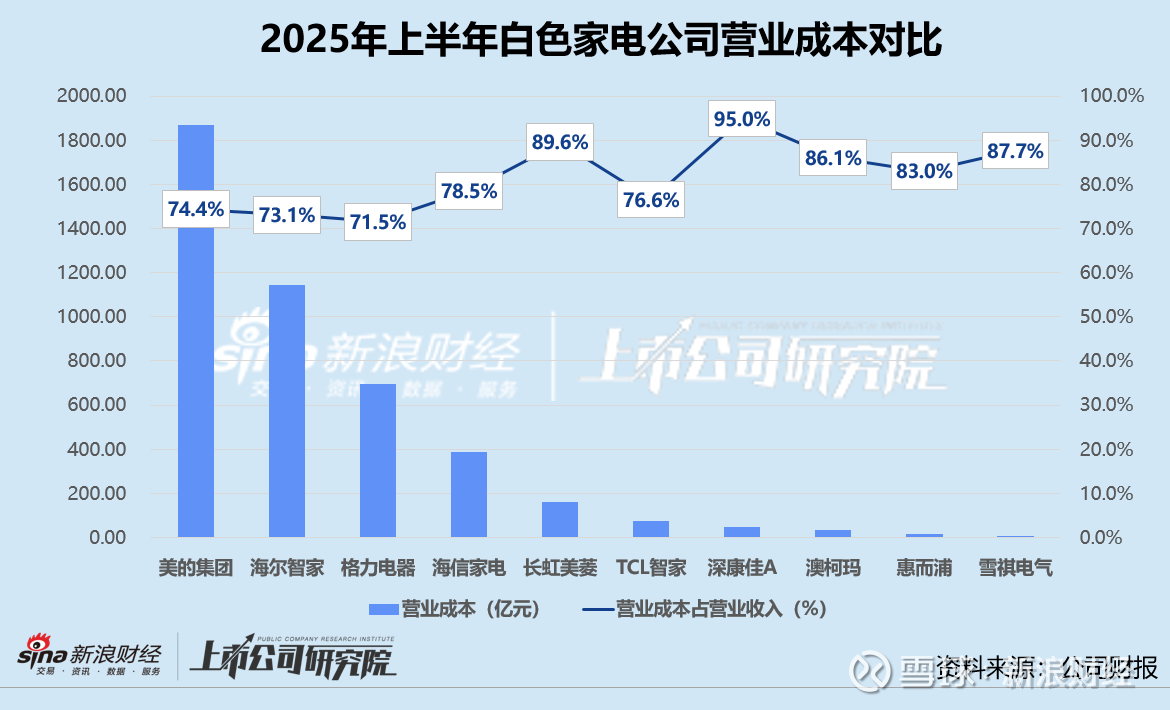 就成本控制而言,白色家电公司上半年的营业成本普遍随着主营业务扩张上升,约一半公司成本同比增长速度高于当期收入增幅。格力电器收入同比微降2.5%,但营业成本与2024年同期基本一致。美的集团同样以1867.86亿元成本位列第一,与第二名海尔智家的差距为723.48亿元。惠而浦因海外业务拓展营业成本同比上涨29.4%,长虹美菱和海尔智家的成本增幅同样在20%以上。雪祺电气因业务规模相对较小,成本仅为7.86亿元,居于末位。