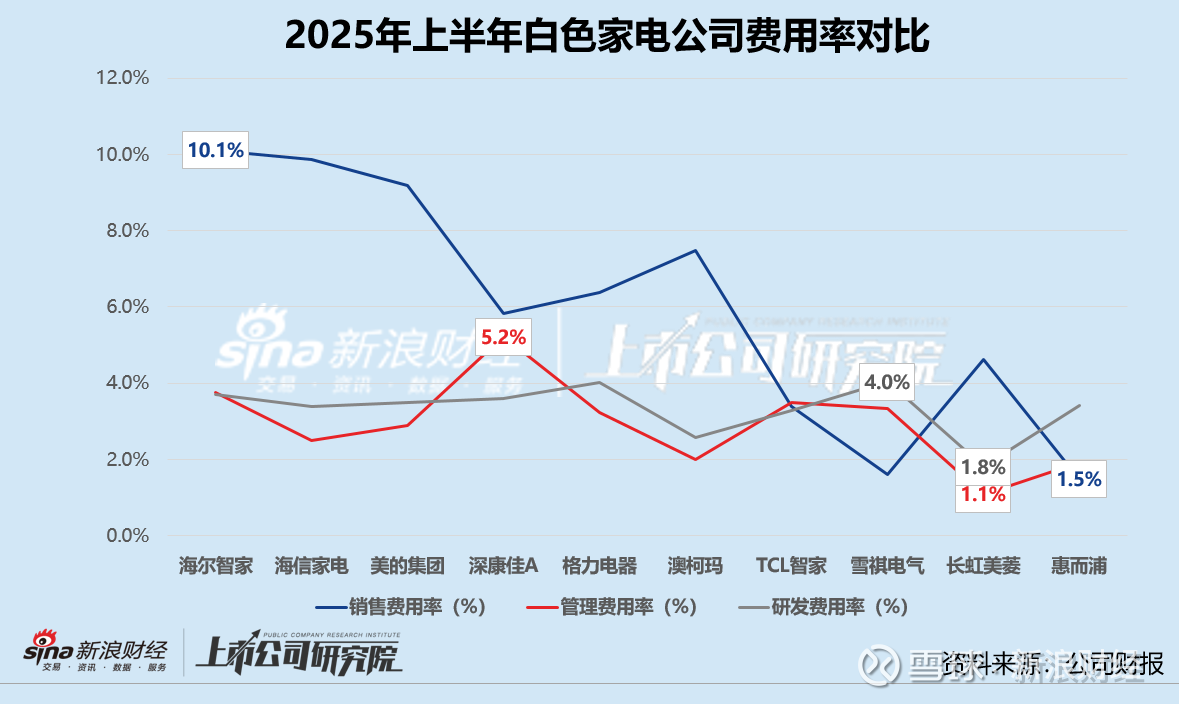 深康佳的管理费用率约为5.2%,在10家公司中排名第一。美的集团、海尔智家、格力电器和海信家电虽然管理费用规模在数十亿级别,但费用率稳定介于2%-3%之间。长虹美菱由于低值易耗品摊销同比激增116.9%,导致管理费用由1.63亿元涨至1.97亿元,但因营业成本同步增长,其费用率仅为1.1%,远低于同行。惠而浦的相关职工薪酬费用近乎“腰斩”,带动管理费用较2024年上半年减少30.7%,费用率降至2.0%以内。
