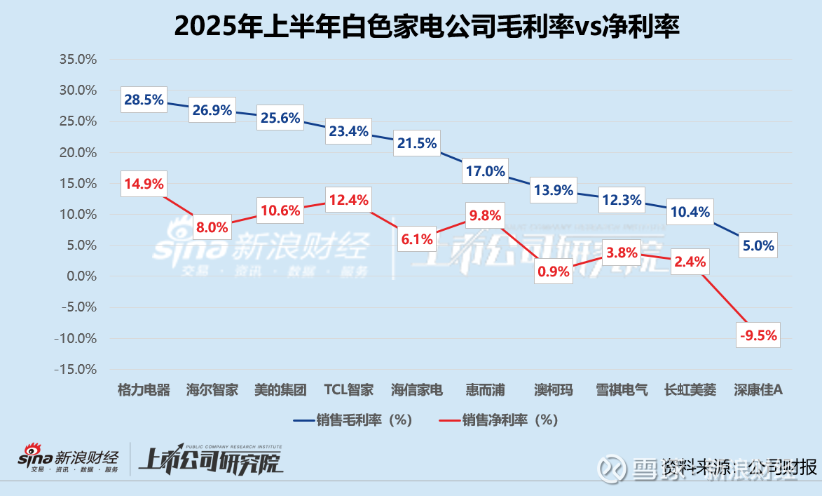 综合作用之下,格力电器销售净利润率在10家公司中领跑,与2024年同期相比小幅增长1.0%,比第二名TCL智家净利率约高2.5个百分点。深康佳以-9.5%排名倒数第一,但已较2024年上半年显著改善14.2%。