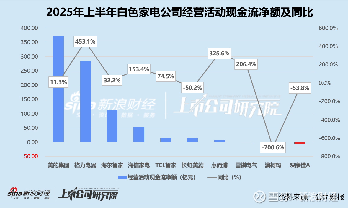 就盈利质量而言,报告期内格力电器、海信家电、惠而浦和雪祺电气经营性现金流转正,澳柯玛和深康佳经营活动产生现金净流出,10家公司中有7家的经营活动现金流净额同比增加。美的集团现金流净额独占鳌头,同比增长11.3%至372.81亿元。格力电器因票据、保函保证金等经营相关受限资金净减少,现金流由2024年上半年的51.22亿元飙升至283.29亿元。澳柯玛则与之相反,由于部分政府采购项目未到收款期,公司上半年现金净流出1658.77万元,而2024年同期为净流入2761.69万元。