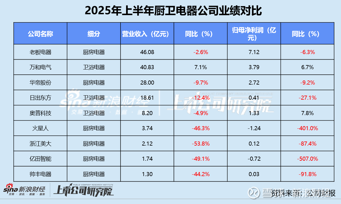就收入规模而言,老板电器以46.08亿元位居榜首,约为第二名万和电气上半年营收的1.12倍,比厨房电器第二名华帝股份高出超18亿元。帅丰电器2025年前6个月仅实现营收1.30亿元,在9家公司中垫底。万和电气是唯一一家收入实现增长的公司,同比增幅为7.1%。业绩公告显示,万和电气的燃气灶具、燃气烤炉等厨房电器类产品收入同比增长23.5%,是驱动业绩向好的关键。而浙江美大收入较2024年同期大幅下降53.8%,为总营收贡献超八成的集成灶产品收入直接“腰斩”,橱柜产品收入也减少近30%,房地产市场的低迷对公司业绩冲击明显。