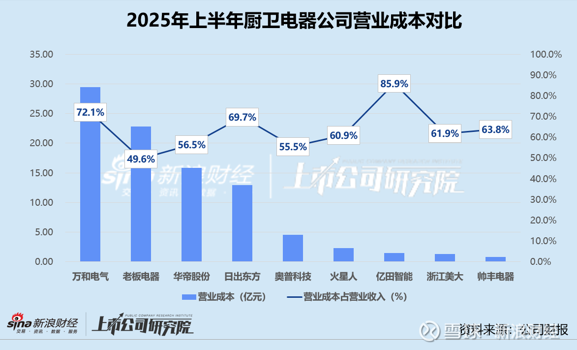 就成本控制而言,厨卫电器上半年的营业成本普遍随着主营业务萎缩下降,只有万和电气的营业成本同比增长15.5%,且高于其同期收入增幅。万和电气的成本规模同样以29.43亿元位列第一,比第二名老板电器的营业成本约高28.9%。帅丰电器营业成本同比下降36.1%,规模不足亿元,远低于其余8家公司。浙江美大成本较2024年同期锐减48.6%,与营业收入变动基本相当。
