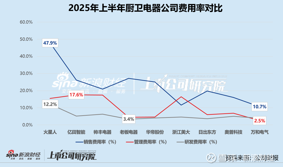 就效率费用而言,亿田智能、帅丰电器、浙江美大和奥普科技的销售费用、管理费用和研发费用在报告期内均有不同程度缩减。老板电器销售费用规模最高达12.49亿元,也是9家公司中唯一实现销售费用同比增长5.0%的公司,其中广告宣传费较2024年同期提高7.6%。火星人的销售费用率约为47.9%,远高于其他可比公司。万和电气销售费用率仅为10.7%,浙江美大销售费用率也相对较低,录得11.5%。