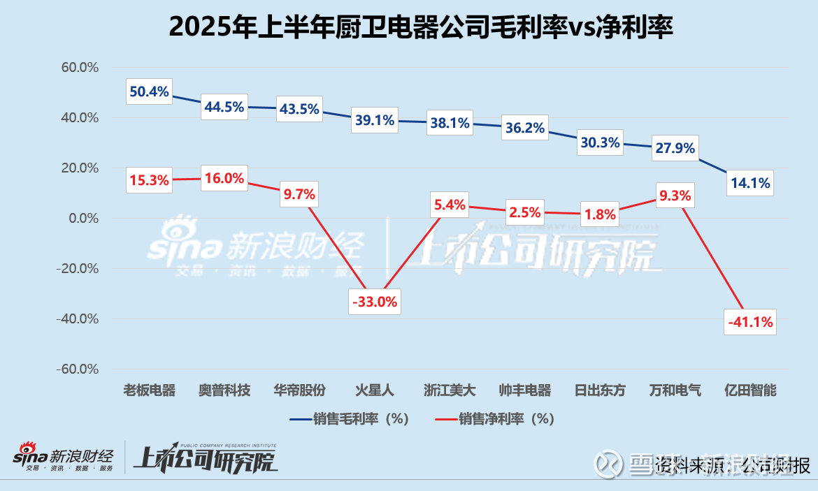 综合作用之下,奥普科技销售净利率以16.0%在9家公司中领跑,与2024年上半年相比增长1.5个百分点,比第二名老板电器净利率略高0.7%。亿田智能以-41.1%排名倒数第一,火星人净利率则约为-33.0%。