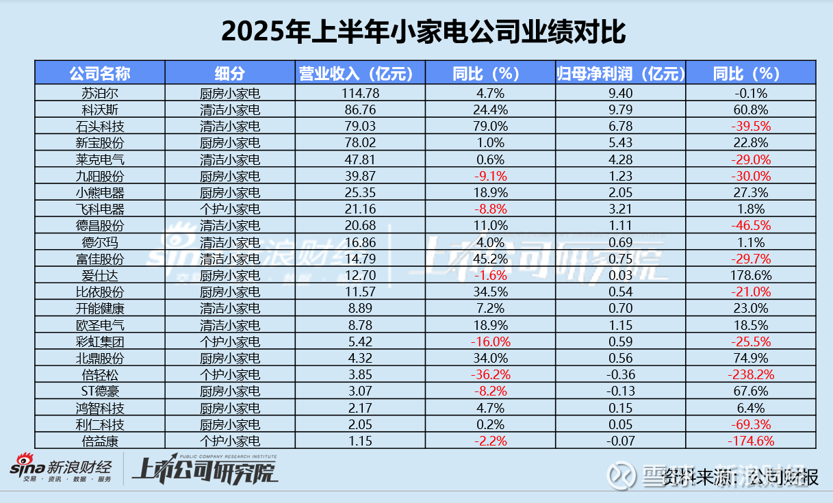 就收入规模而言,苏泊尔以114.78亿元位居榜首,约为第二名科沃斯上半年营收的1.32倍,比厨房小家电收入第二名新宝股份高出接近37亿元。倍益康2025年前6个月仅实现1.15亿元,在22家公司中垫底,甚至不足个护小家电同领域榜首飞科电器21.16亿元营收的零头。石头科技收入同比增速达79.0%,业绩公告显示,其海外销售由于品牌建设推进、渠道布局和营销策略精细化,同比大幅增长72.1%,驱动业绩向好。而倍轻松收入较2024年同期大幅下降36.2%,公司解释称主要是线上渠道销售收入下降所致。