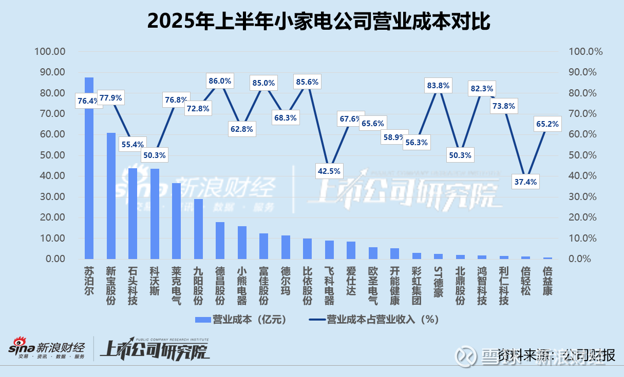 就成本控制而言,小家电公司上半年的营业成本普遍随着主营业务扩张上升,约一半公司成本同比增长速度高于当期收入增幅,倍益康是唯一一家收入下滑但营业成本上涨的企业。苏泊尔同样以87.68亿元成本位列第一,比第二名新宝股份高出近27亿元。石头科技受产品结构、价格矩阵和关税政策变动综合影响,营业成本较2024年同期显著增长114.8%至43.81亿元。倍益康因业务规模相对较小,成本尽管同比增长3.3%,但整体仍居于末位。降幅最高的是倍轻松,营业成本约为2024年上半年约六成,与销售收入下降幅度基本相当。