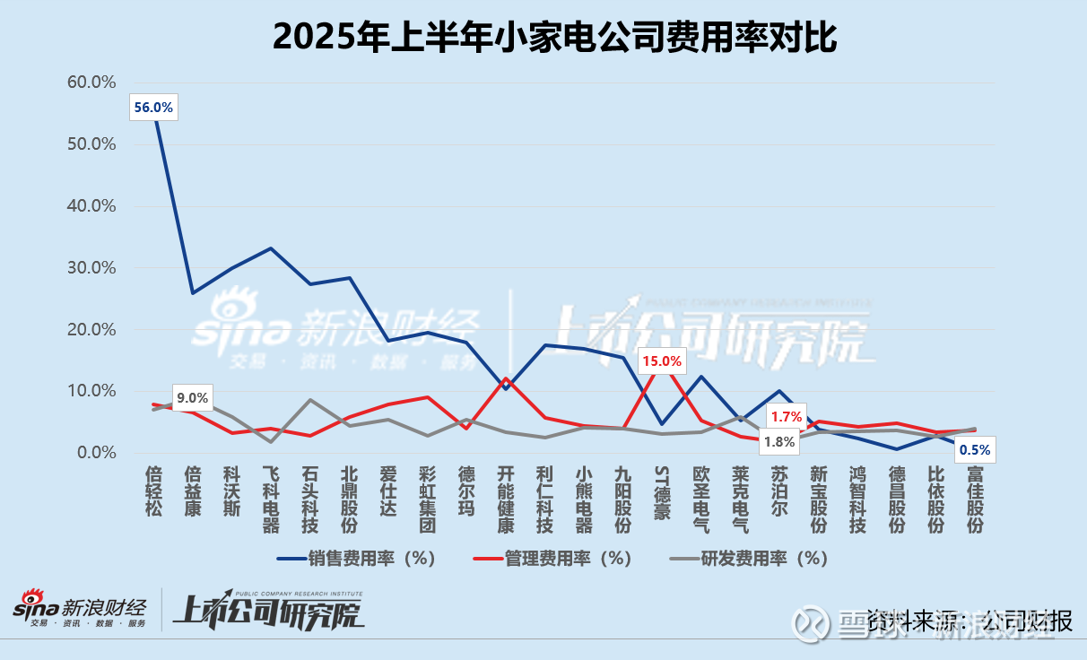 小家电公司的研发费用率基本保持在2.5%-6.0%之间。2025年1-6月,倍益康研发费用率达到9.0%,石头科技和倍轻松研发费用率也在可比公司之上,分别为8.7%、7.0%。飞科电器和苏泊尔研发费用率均为1.8%,明显落后于同行。九阳股份、欧圣电器研发投入同比减少16.2%、14.9%,而ST德豪小家电项目研发费用同比提高129.2%,推动费用规模增长40.2%至946.73万元。