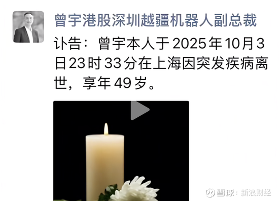 红星资本局10月5日消息,越疆科技(02432.HK)副总裁曾宇的朋友圈发布讣告称,曾宇本人于2025年10月3日23时33分在上海因突发疾病离世,享年49岁。