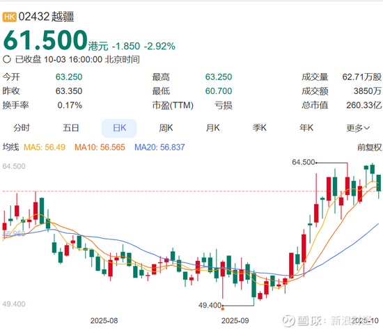 截至10月3日收盘,越疆科技股价报收61.5港元,年内涨幅超159%,总市值260.33亿港元。