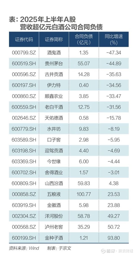 万得数据显示,2025年上半年,A股营业收入超亿元的18家白酒公司中,12家公司合同负债同比下滑,6家公司合同负债同比增长。