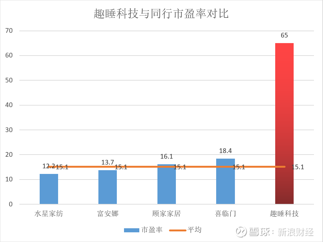 目前趣睡科技市盈率(TTM)高达65倍,而主要竞争对手——喜临门(603008.SH)、顾家家居(603816.SH)、水星家纺(603365.SH)、富安娜(002327.SZ)的市盈率分别为18.4倍、16.1倍、12.2倍和13.7倍,行业平均市盈率为15.1倍,趣睡科技估值是行业均值的3倍以上。