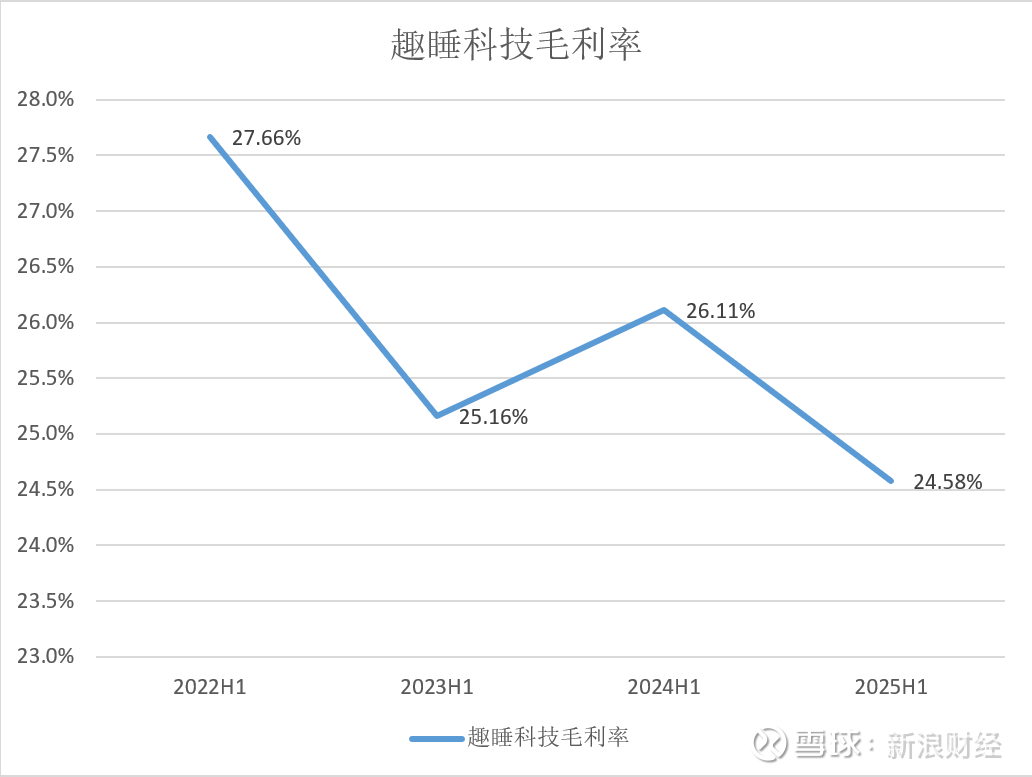 2022年上半年至2025年上半年,趣睡科技销售毛利率分别为27.66%、25.16%、26.11%和24.58%,整体呈下降趋势,2025年上半年毛利率较2022年上半年下降3.08个百分点。