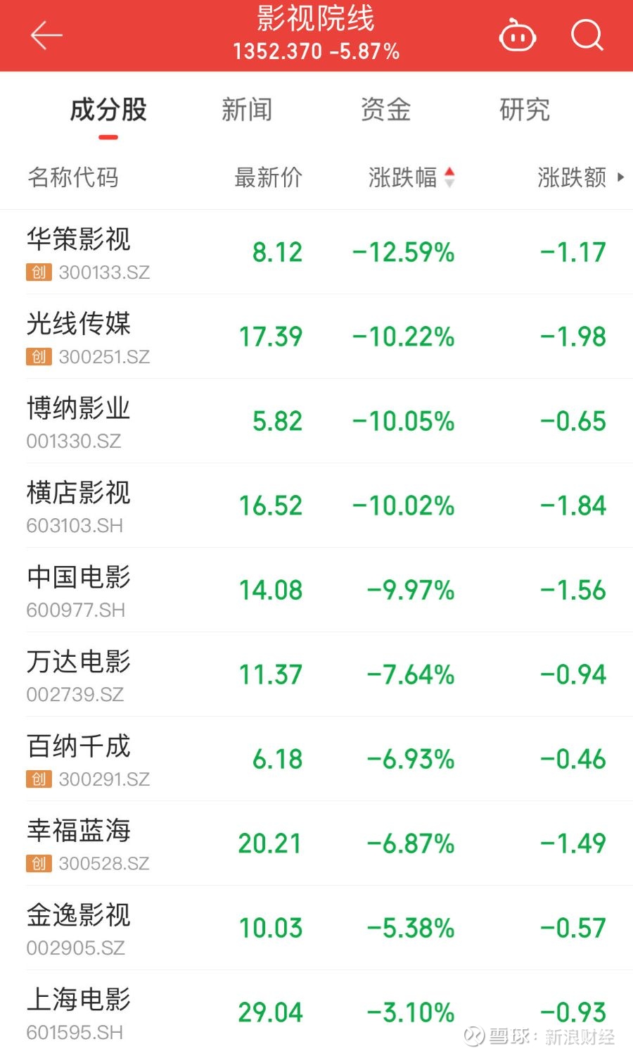 10月9日,影视院线板块开盘遭遇重挫,同花顺iFinD显示,截至午盘,影视院线(801766.SL)跌幅扩大至5.87%。多家影视公司股价同步大跌,华策影视(300133.SZ)大跌12.59%、光线传媒(300251.SZ)跌超10%,博纳影业(001330.SZ)、横店影视(603103.SH)、中国电影(600977.SH)跌停,万达电影(002739.SZ)、幸福蓝海(300528.SZ)等跟跌。