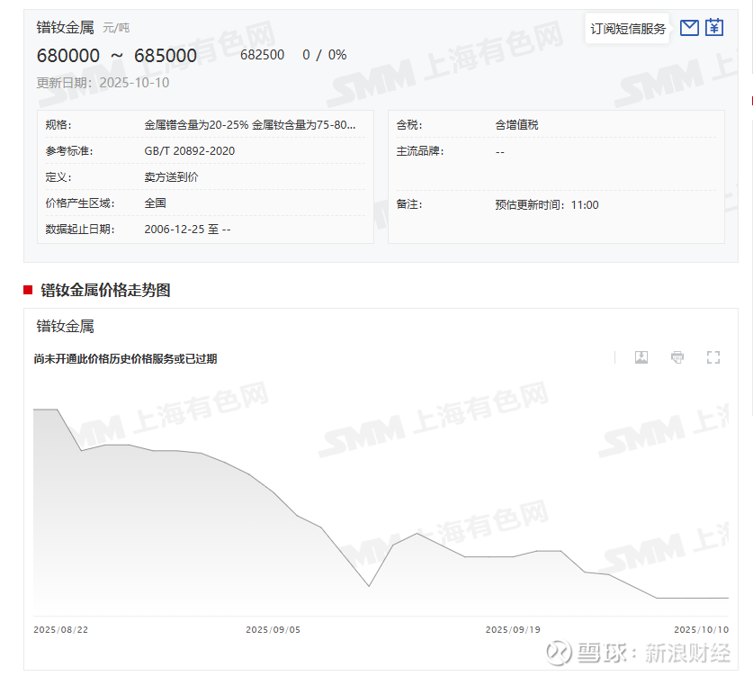 据SMM最新的报价显示:10月10日,镨钕金属价格稳定在68-68.5万元/吨,金属镝价格稳定在2020-2040元/千克,金属铽报价稳定在8650-8700元/千克。