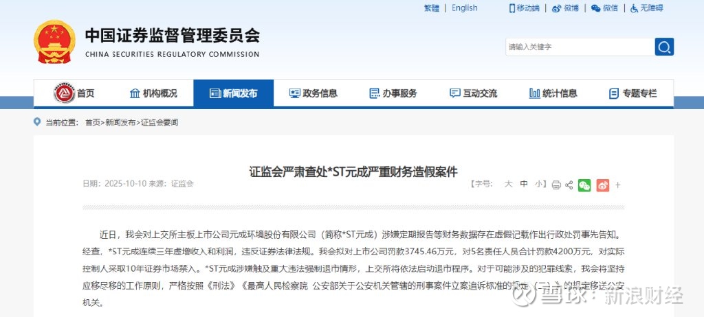 证监会拟对上市公司罚款3745.46万元,对5名责任人员合计罚款4200万元,对实际控制人采取10年证券市场禁入措施。此外,*ST元成涉嫌触及重大违法强制退市情形,上交所将依法启动退市程序。