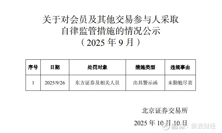 10月10日,北交所官网发布了2025年9月对会员及其他交易参与人采取自律监管措施的情况公示。因未勤勉尽责,东方证券及相关人员被北交所采取出具警示函的措施。