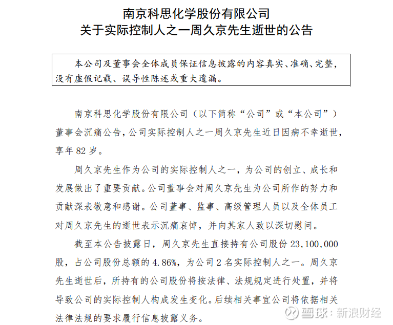 昨日晚间(10月10日),南京科思化学股份有限公司(简称:科思股份,股票代码:300856)沉痛公告,公司实际控制人之一周久京近日因病逝世,享年82岁。据悉,周久京系科思股份创始人之一,曾带领和见证科思股份在深圳创业板成功上市。