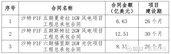 沙特PIF五期夏奇拉1GW风电项目工程总承包合同,合同金额6.63亿美元,项目建设期26个月;