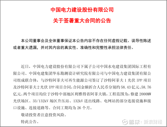 此外,中国电建也在公告中表示,下属子公司中国水电建设集团国际工程有限公司、中国电建集团华东勘测设计研究院有限公司与中国电力建设集团有限公司组成联合体,与沙特阿菲夫可再生能源公司签订了沙特阿菲夫1光伏和沙特阿菲夫2光伏项目合同。