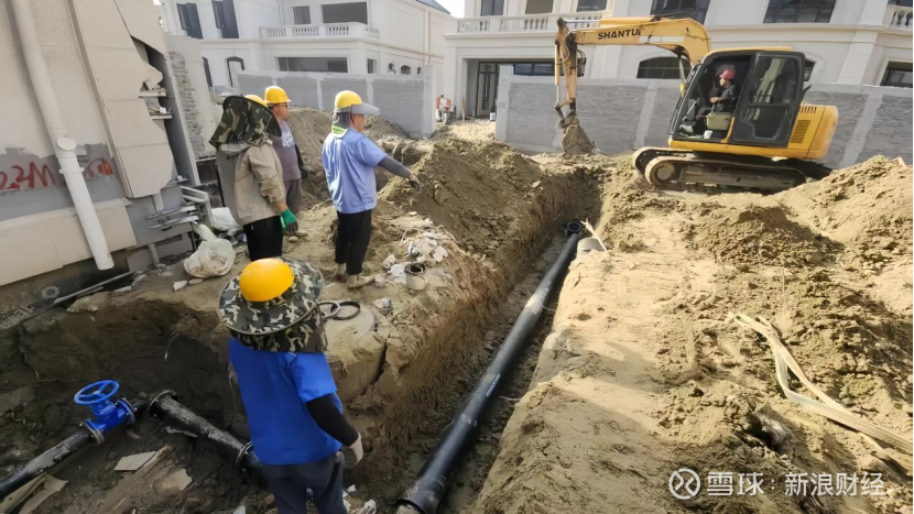 (海安市惠泽净水有限公司施工人员正在进行管网铺设)