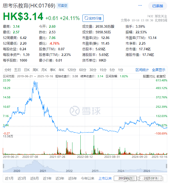 思考乐教育(01769.HK),于2019年6月21日在港交所挂牌上市,当时IPO募资约4.60亿港元。截至发稿时间,思考乐教育每股报3.14港元,总市值约17.74亿港元。