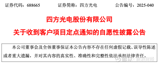 10月16日,四方光电发布“四方光电股份有限公司关于收到客户项目定点通知的自愿性披露公告”,公告称: