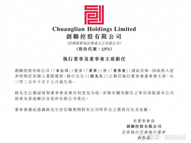 10月17日,创联控股有限公司(创联控股,02371.HK)公告称,因欲投入更多时间于其个人业务发展,路行已辞任创联控股有限公司执行董事兼董事会主席,辞任自2025年10月17日起生效。