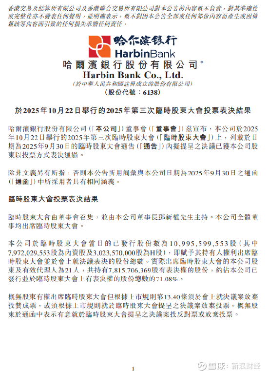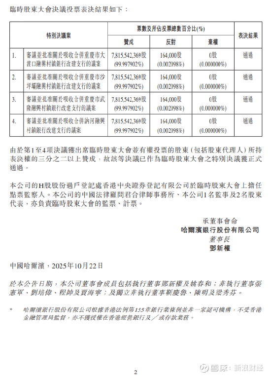10月22日金融一线消息,哈尔滨银行发布公告称,该行2025年第三次临时股东大会投票审议并通过了四项议案,包括审议并批准关于吸收合并重庆市大渡口融兴村镇银行改建支行的议案、审议并批准关于吸收合并重庆市沙坪坝融兴村镇银行改建支行的议案、审议并批准关于吸收合并重庆市武隆融兴村镇银行改建支行的议案,以及审议并批准关于吸收合并讷河融兴村镇银行改建支行的议案。