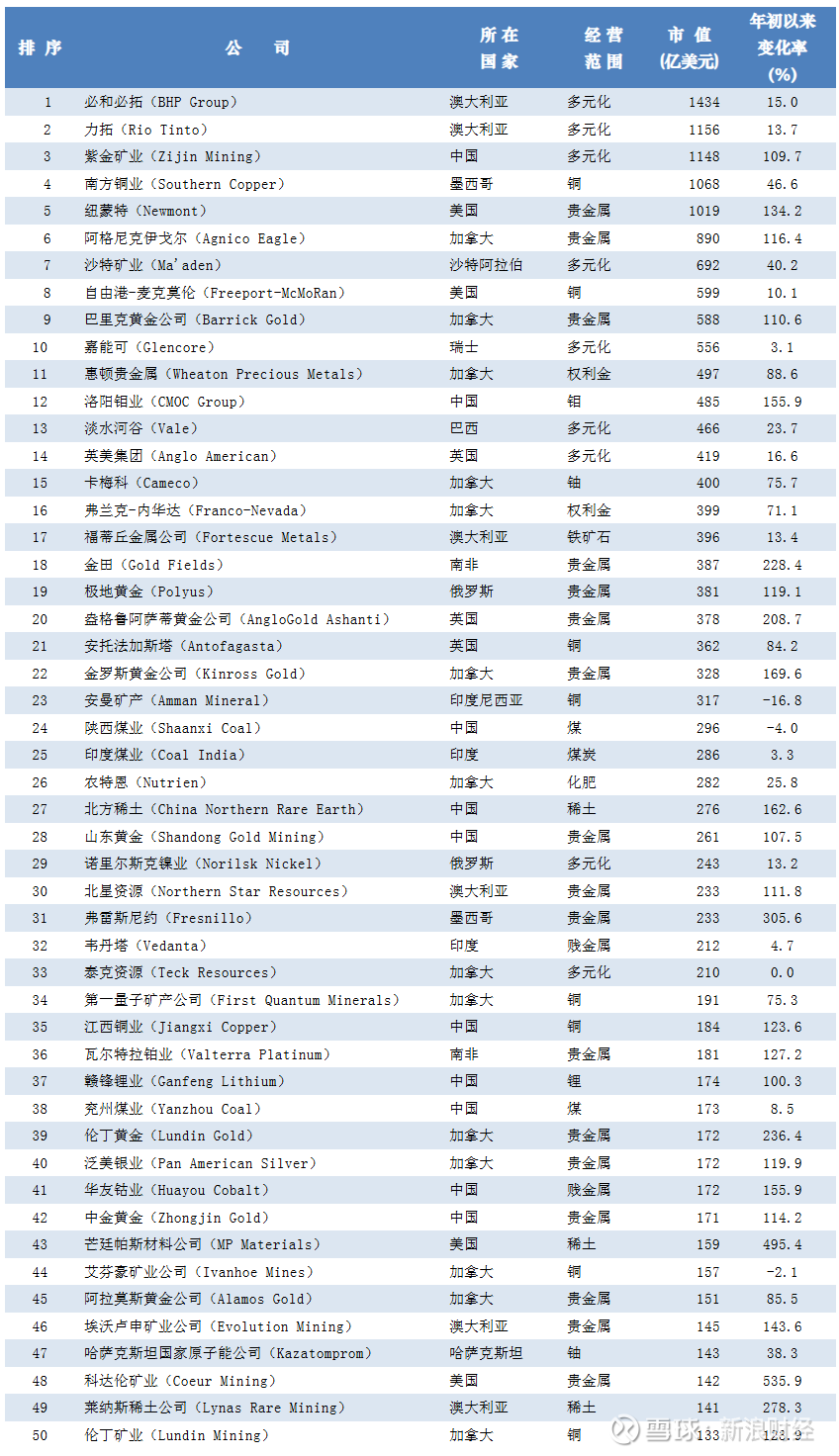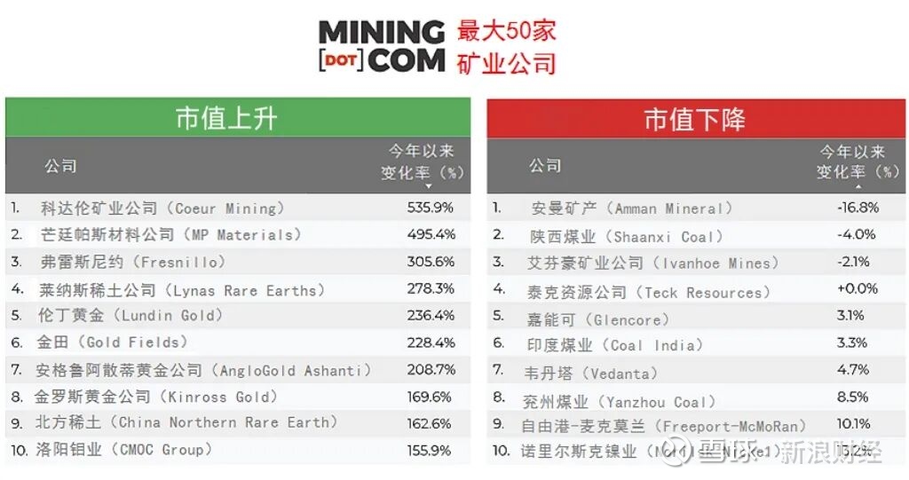 世界最大多元化巨头和金铜矿企的排名也发生了巨大变化。