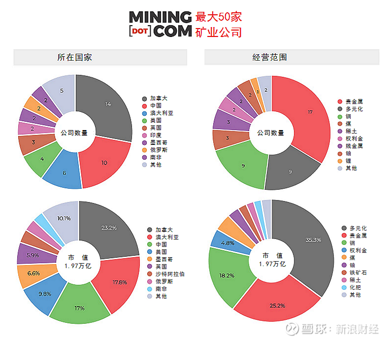 自Mining.com网站进行世界前50家矿企排名以来,最大的两家矿企——必和必拓、力拓公司的市值一直在1000亿美元以上(偶尔会出现上下波动)。现在则有5家企业市值已经或可能达到此水平。
