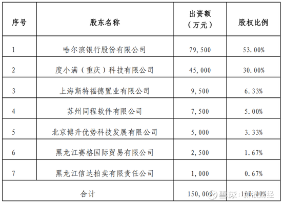 据官网介绍,哈尔滨哈银消费金融有限责任公司(简称 “哈银消金”)是经原中国银保监会批准、全国第19家开业、国内首家获互联网巨头战略投资的持牌消费金融公司。由哈尔滨银行主导发起成立,2019年引入战略投资者度小满金融完成增资扩股,现注册资本15亿元,哈尔滨银行持股53%,度小满(重庆)科技有限公司持股30%。