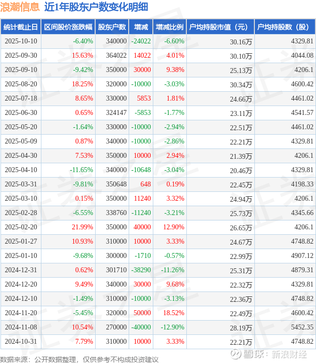 证券之星消息,近日浪潮信息披露,截至2025年10月10日公司股东户数为34.0万户,较9月30日减少2.4万户,减幅为6.6%。户均持股数量由上期的4044.0股增加至4330.0股,户均持股市值为30.16万元。