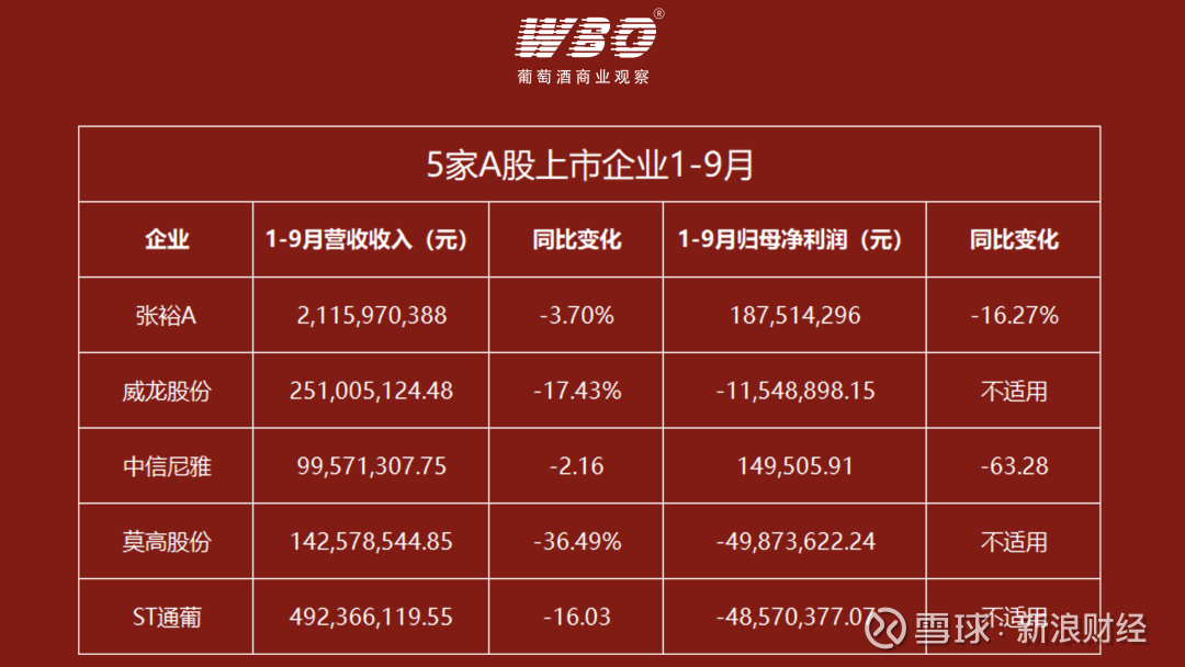 1-9月仅张裕和中信尼雅盈利,其余三家亏损共超1亿元