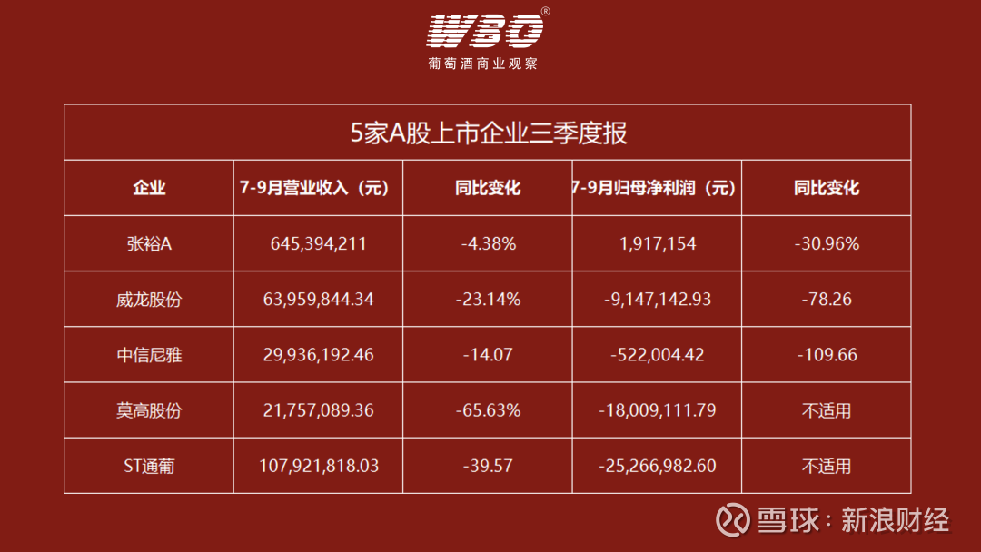 从第三季度(7—9月)单季表现来看。五家企业共实现营收8.69亿元,张裕A以6.45亿元占比74.27%,位列首位;威龙股份居次,占比7.36%,其余企业占比均不足5%。利润方面,仅张裕单季保持盈利,中信尼雅由盈转亏,其余三家亏损进一步扩大。