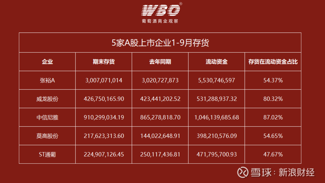 在此背景下,葡萄酒上市公司库存水平也仍居高位。5家企业期末合计存货达47.87亿元,同比上升1.8%。其中有两家企业的库存占流动资产比例超过80%,面临较大现金流压力及库存贬值风险。