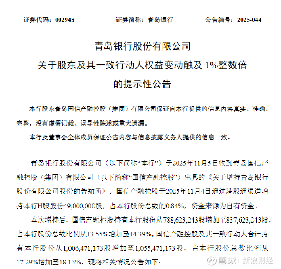 11月5日金融一线消息,青岛银行发布公告称,股东国信产融控股通过港股通渠道增持该行H股4900万股,占股份总数的0.84%,资金源于自有资金。本次增持后,国信产融控股持股从7.89亿股增至8.38亿股,占比从13.55%增至14.39%;其与一致行动人合计持股从10.06亿股增至10.55亿股,占比从17.29%增至18.13%。此次增持是履行此前计划,且计划尚未实施完毕。