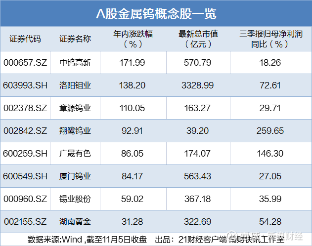 11月5日,金属钨板块尾盘拉升,中钨高新(000657.SZ)强势涨停,章源钨业(002378.SZ)、翔鹭钨业(002842.SZ)、厦门钨业(600549.SZ)、锡业股份(000960.SZ)、洛阳钼业(603993.SH)等多股跟涨。