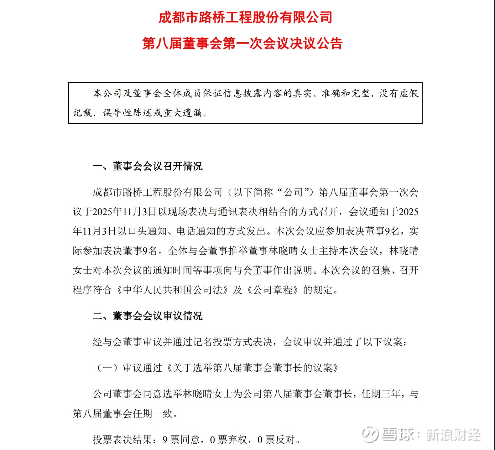 上证报中国证券网讯(章林 记者 徐锐)11月4日,成都路桥公告披露,公司董事会同意选举林晓晴为公司第八届董事会董事长,任期三年,与第八届董事会任期一致。
