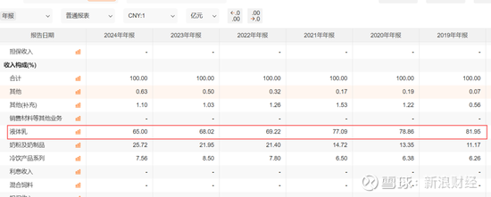 蒙牛乳业情况同样不容乐观。其液态奶业务营收占比长期高达八成以上。