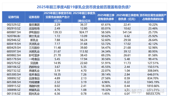 截至三季度末,皇氏集团、庄园牧场、伊利股份、骑士乳业、新乳业、天润乳业、三元股份、光明乳业、妙可蓝多、一鸣食品等10家乳企账上的真金白银难以覆盖有息负债。